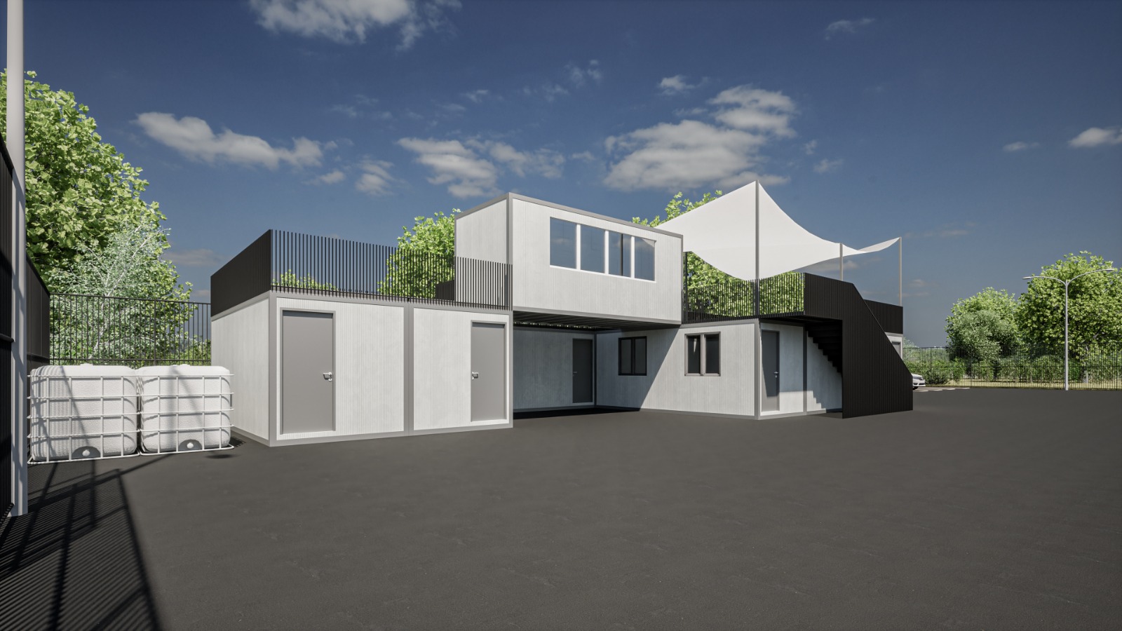 Clădire modulară din containere standard cu funcționalități multiple. Autonomie de curent electric, apă, canalizare și încălzire.